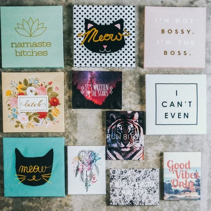 (Left Image: Namaste Bitch, Meow, I’m Not Bossy I’m The Boss, Bitch Flowers, I Can’t Even, Good Vibes Only designed by Rebeca Tellez)